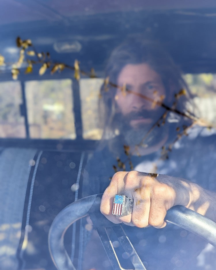 Bold, weathered, and undeniably iconic, this large, chunky ring tells a story of freedom and adventure. Crafted of solid sterling silver, the ring proudly displays an American flag design, of petrified wood and authentic Kingman turquoise. Wear it as a statement of independence, a nod to the past, and a celebration of the untamed spirit of the American Southwest.